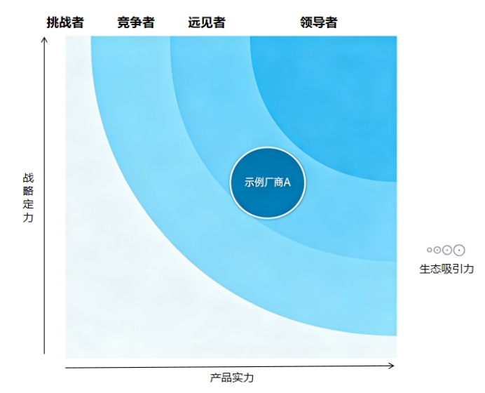 最終,我們不會簡單排出123名,而是繪制出"引力象限圖":X軸代表企業(yè)當(dāng)前的產(chǎn)品實(shí)力,而Y軸則代表企業(yè)當(dāng)前產(chǎn)品戰(zhàn)略,圓圈大小則代表生態(tài)吸引力。同時(shí)引力象限被劃分為四個(gè)區(qū)域——領(lǐng)航者、遠(yuǎn)見者、競爭者、挑戰(zhàn)者。這種二維定位比線性排名更能反映企業(yè)的真實(shí)處境。